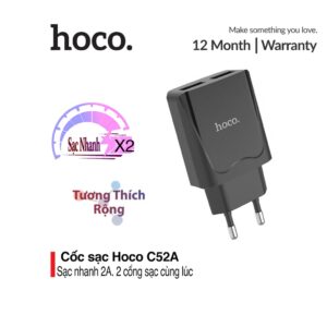 Củ sạc nhanh 2 cổng sạc Hoco C52/C52A sạc nhanh 2.1A, chân sạc chuẩn USA, chất liệu PC siêu bền, chống cháy nổ