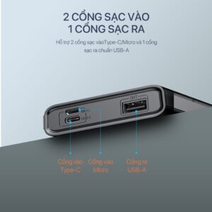 – Hai cổng sạc vào Type-C và Micro, một cổng sạc ra USB-A