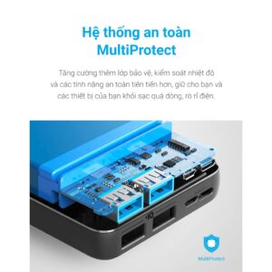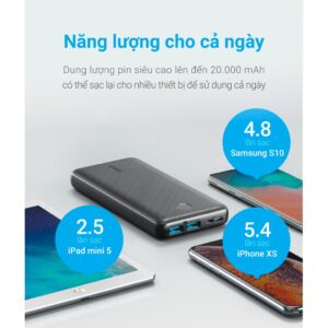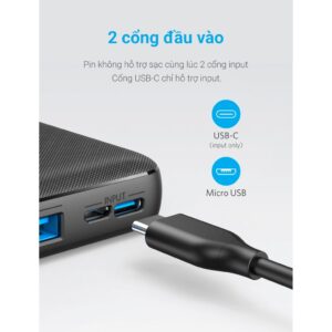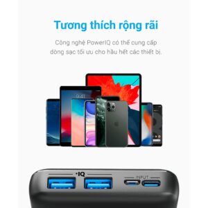 Pin dự phòng dung lượng cao 20000mAh với công nghệ sạc tối ưu PowerIQ và cổng sạc vào theo chuẩn USB-C (input only) cùng với MicroUSB tiện lợi, tương thích với iPhone, Samsung, iPad…