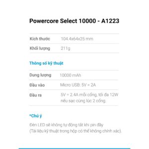A1223H21+A262021: Pin dự phòng Powercore Select 10.000mAh A1223 trắng + Sạc Powerport mini 12w A2620